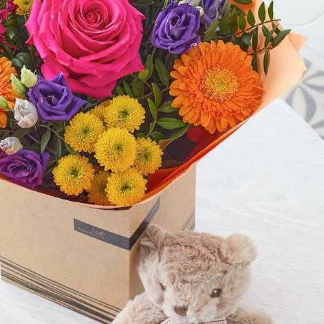 Each and every hand-tied in our New Baby Gift Set is one-of-a-kind, created by an artisan florist using the freshest stems available on the day so, whilst your bouquet will look different to the one pictured, it’ll still be just as lovely (plus it arrives accompanied with a hand-written gift card and an adorable teddy – what’s not to love?).