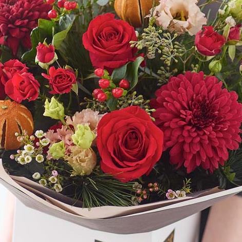 One of our bigger festive bouquets, this one is a stunning arrangement of fresh Christmassy flowers, expertly chosen by a local florist.