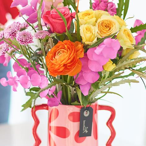 A wonderfully fun vase with wavy handles, filled with a handmade bouquet of fresh bright flowers.