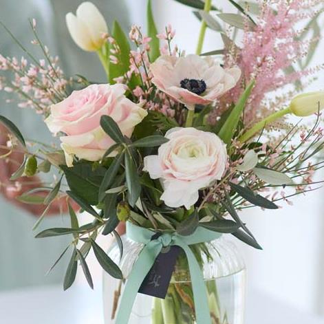 An exquisite array of blooms perfectly arranged in a ribbed vase handblown in Europe. It'll feature flowers in soft shades inspired by the spring dawn. Expect peach, dusky pink, lemon and cream tones plus dried flowers and foliage.